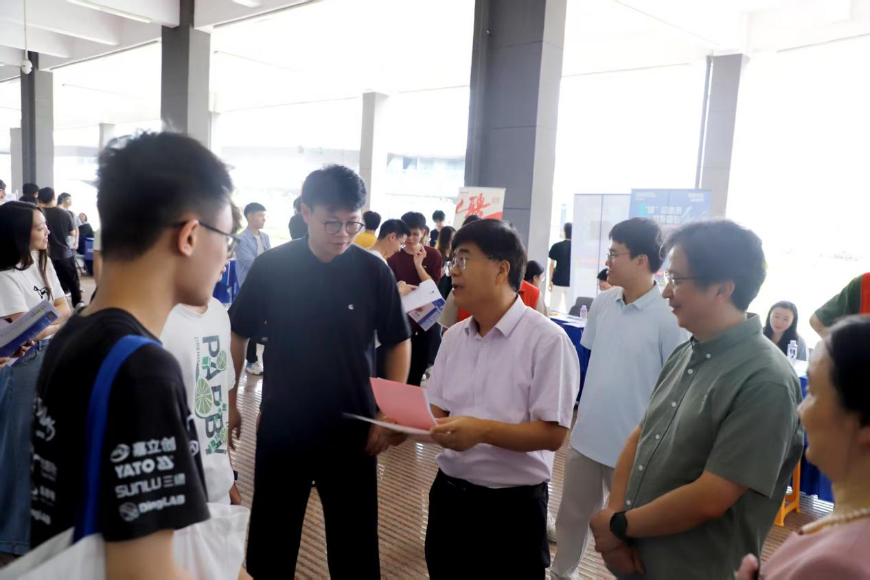当天下午,招聘会现场人头攒动,企业展位前毕业生们手持简历与企业代表深入交流。汪永成、陈云飞、罗绍武等一行来到招聘会现场与求职学生亲切交流,给他们加油鼓劲。汪永成走访多家企业展位,深入了解了各企业的用人需求,向企业单位重点介绍了学校及学院的人才培养特色,同时现场还根据简历为多位毕业生“代言”,向招聘企业进行了重点推荐。多家企业负责人对深大毕业生的综合素质给予高度评价,源城技术招聘负责人表示:“深大学生专业适配度高、岗位适应力强,是我们长期合作的首选目标院校。”