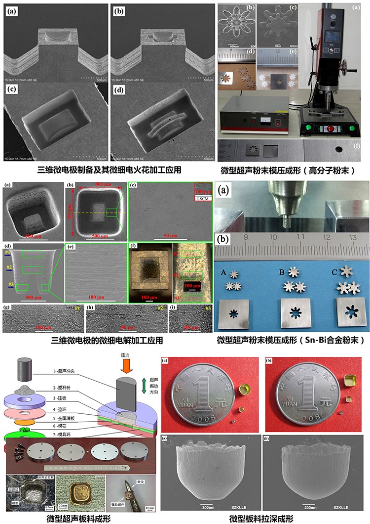 2:微成形技术。研究非晶、超细晶、纳米晶等微成形材料的新型制备工艺,揭示材料微结构与性能的演变规律;研究微成形的原理、新方法与新工艺,阐明微成形过程中的尺度效应机理,提出微型零件的质量控制方法。近期以大批量、低成本和高效率量产微零件为目标,研究粉末电阻热微体积成形(Micro-RWM)、微型超声粉末模压成形(Micro-UPM)、微型超声塑化柔性冲头板料成形(Micro-USF)、微型超声塑化柔性冲头挤压成形(Micro-UFE)、微型高分子粉末介质板料成形(Micro-PPF)等新型微成形技术。